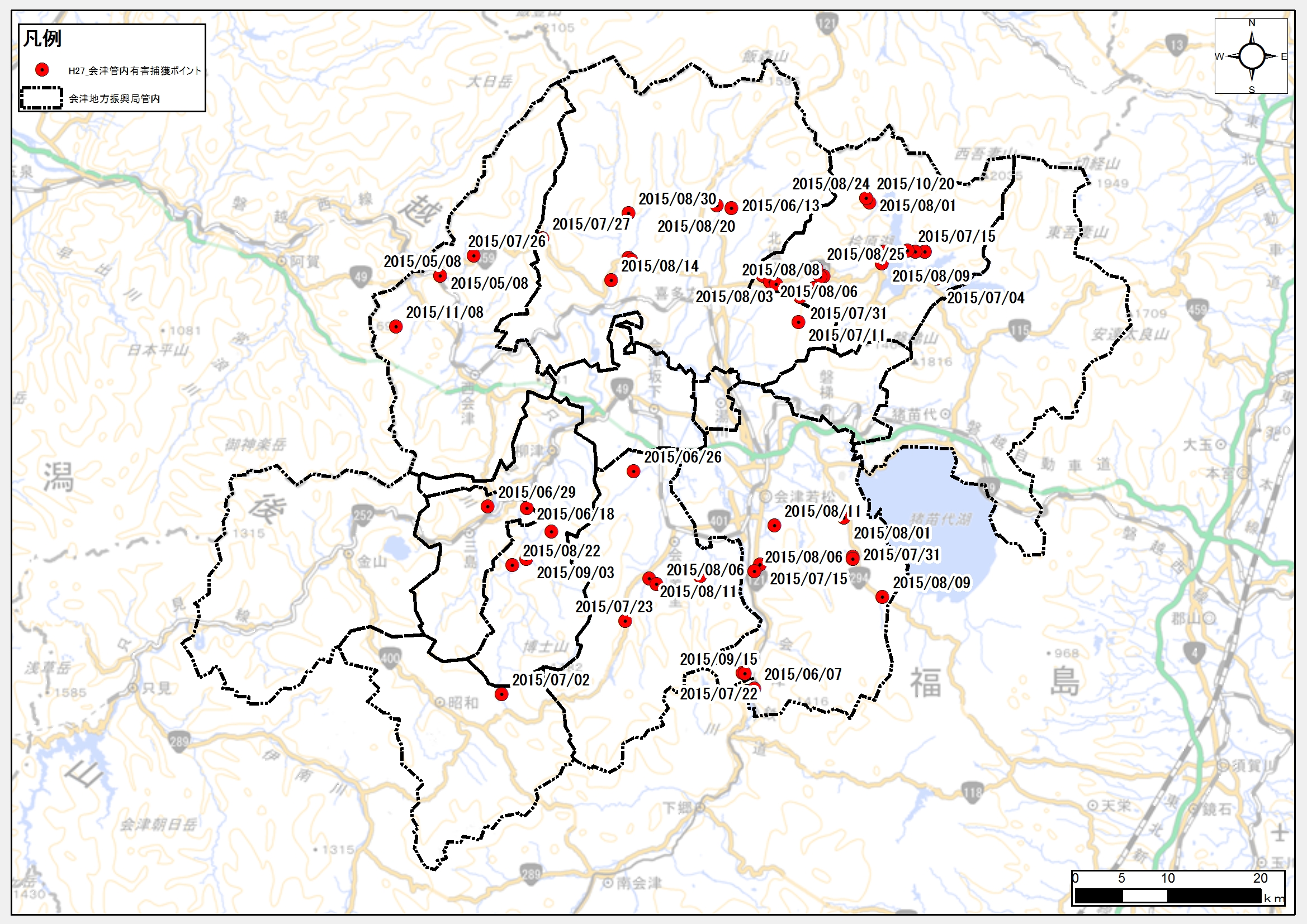 会津管内のツキノワグマの有害鳥獣捕獲位置図