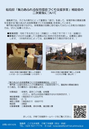 つきましては、下記のとおり補助対象となる施設を募集しますので、「令和7年度福島県魅力あふれる保育環境づくり支援事業実施要領」及び「令和7年度福島県魅力あふれる保育環境づくり支援事業補助金募集要項」「福島県魅力あふれる保育環境づくり支援事業補助金二次募集要項」をご覧いただき、応募書類の提出をお願いします。