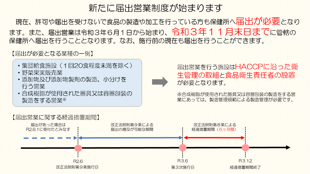 食品営業にあっては、公衆衛生に与える影響の程度を整理し、営業許可業種以外の一定の営業者を対象として、届出を義務化する届出営業制度が創設されました。届出営業にあたっては、令和3年11月末日までに届出を行うとともに、HACCPに沿った衛生管理の取組と食品衛生責任者の設置が必要となります。