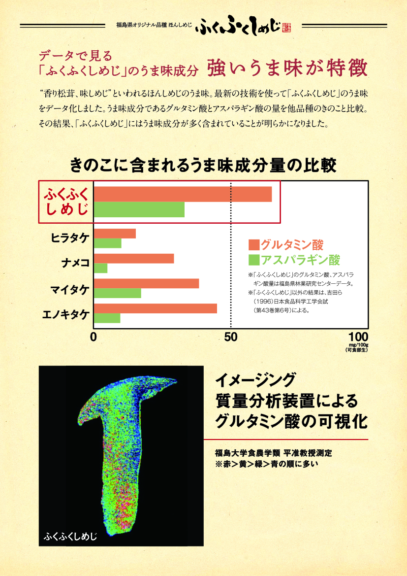 天然のほんしめじと同じ食感・うま味が味わえるきのことして、福島県では、栽培に成功したオリジナル品種のほんしめじ(H106)に「ふくふくしめじ」という愛称をつけました。