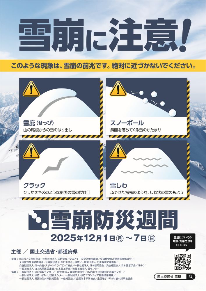 国土交通省と各都道府県では、毎年12月1日から7日までを『雪崩防災週間』と位置づけ、本格的な降雪期を前に、雪崩被害の防止に関する様々な防災・広報活動を実施しています。