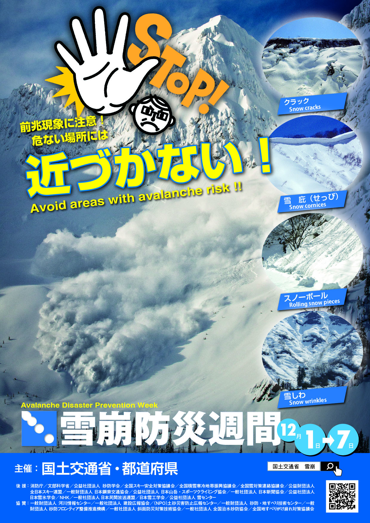 国土交通省と各都道府県では、毎年12月1日から7日までを『雪崩防災週間』と位置づけ、本格的な降雪期を前に、雪崩被害の防止に関する様々な防災・広報活動を実施しています。