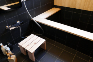 「浴室と洗面所は、父と兄の手を借りながら自分で。漆喰壁の一部と床は、家族全員で塗りました」と友紀さん。ところが工事を始めてみると楽しいことより大変なことの方が多かったと苦笑い。「材料と工具を揃えても、施工の方法が分からないのでネットで調べるのですが限界もあって。特に浴室は、本当に大変でした。タイルとヒノキはWebで購入しました。成形の材料をカットした後、端材をきれいに仕上げるのも苦労しました。モルタルもそう。練り具合がよく分からなくて無料の動画サイトで調べたり、工務店の方に教えてもらったりして完成させました」。