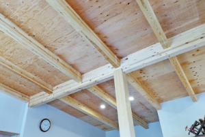 リビングは珪藻土の塗り壁、天井は梁と野地板を「あらわし」に。 |