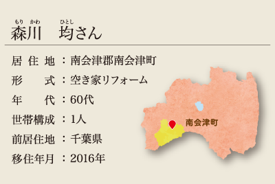 会社員時代、仕事で何度も東北を訪れていた森川さんは、55歳くらいからインターネットだけでなく、自分の目で現地を見ながら移住のための情報収集をしていました。「住むからには、雪も降雪量だけでなく、いつまで根雪が残るか等もちゃんと分かって住みたいですよね」。見晴らしのいい高台に建つ古民家との出会いは、空き家バンクでした。隣家から距離があり、近くに温泉があることを条件に絞り込んで行くと、南会津町の古民家がヒットしました。