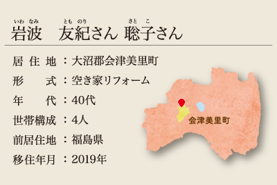 「会津美里町の古民家は、インターネットの空き家バンクで見つけて役場に相談しました」。購入する際は、移住希望者を募る集いで出会った、会津の古民家や空き家関係のNPOの方のアドバイスも参考にしたそうです。「決め手はキレイだったこと。直前まで暮らしていた方が、とても丁寧に住んでいらして薪ストーブ付き。値引きもしていただけました。福島県の補助金もありがたかったです。経済的な負担を小さくすることができました」と聡子さん。