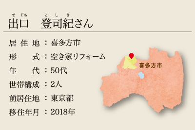 空き家を住めるようにするまで出口さんは、市役所から紹介された複数の補助金を活用。1つは、住宅購入と浄化槽埋設の費用で喜多方市の補助金を。もう1つは、ハウスクリーニングとリフォーム費用で、最大190万円の補助が受けられる福島県の『空き家・ふるさと復興支援事業』を活用。「やはり不動産は大きな買い物ですし、リフォーム費用もかかります。補助金はありがたかったです」。