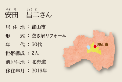 無事工事も終わり2016年11月、安田さんは郡山市に住民異動届を提出しました。移住から間もなく3年。暮らしにも慣れたと話します。「歩いて病院や買い物に行けますし、市内周遊バスは100円です。転勤でいろんな町で暮らしましたけど初乗りって大抵200円ですよ。近所に町会長さんと民生委員さんが住んでいるのも心強いです」。現在奥様は、お勤めしているそうですが、安田さんは悠々自適の生活。週末は、趣味の登山に出かけることもあるそうです。移住成功のポイントを伺うと「徹底的に調べることです」と安田さん。「誰も教えてくれないので、空き家情報にしても、補助金にしても、とにかく徹底的に調べることですね」と話してくださいました。