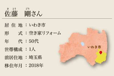 長年、埼玉県で塾の講師をしていた佐藤剛さんの夢は、故郷で小中高生のための塾を開くことでした。2018年春、いわき市内で不動産業を営む弟さんから「塾にぴったりの物件が見つかったよ」と連絡が入り佐藤さんは、タイミング的にも今がチャンスかもしれないと独立を決めたそうです。弟さんには、自身の住まいも紹介してもらったそうです。「経費節約で、どんな家でも我慢しながら住もうと思っていました」と佐藤さん。