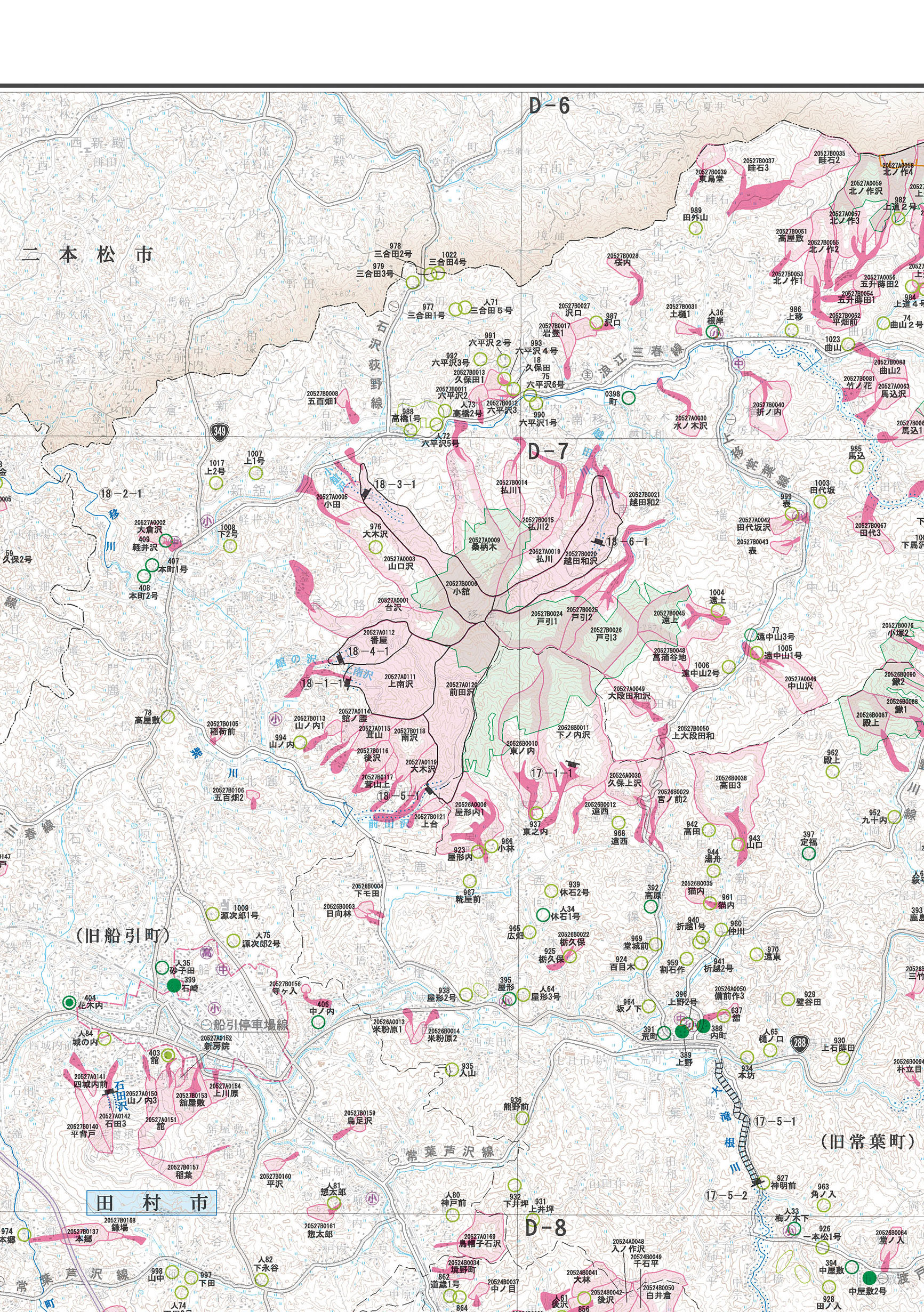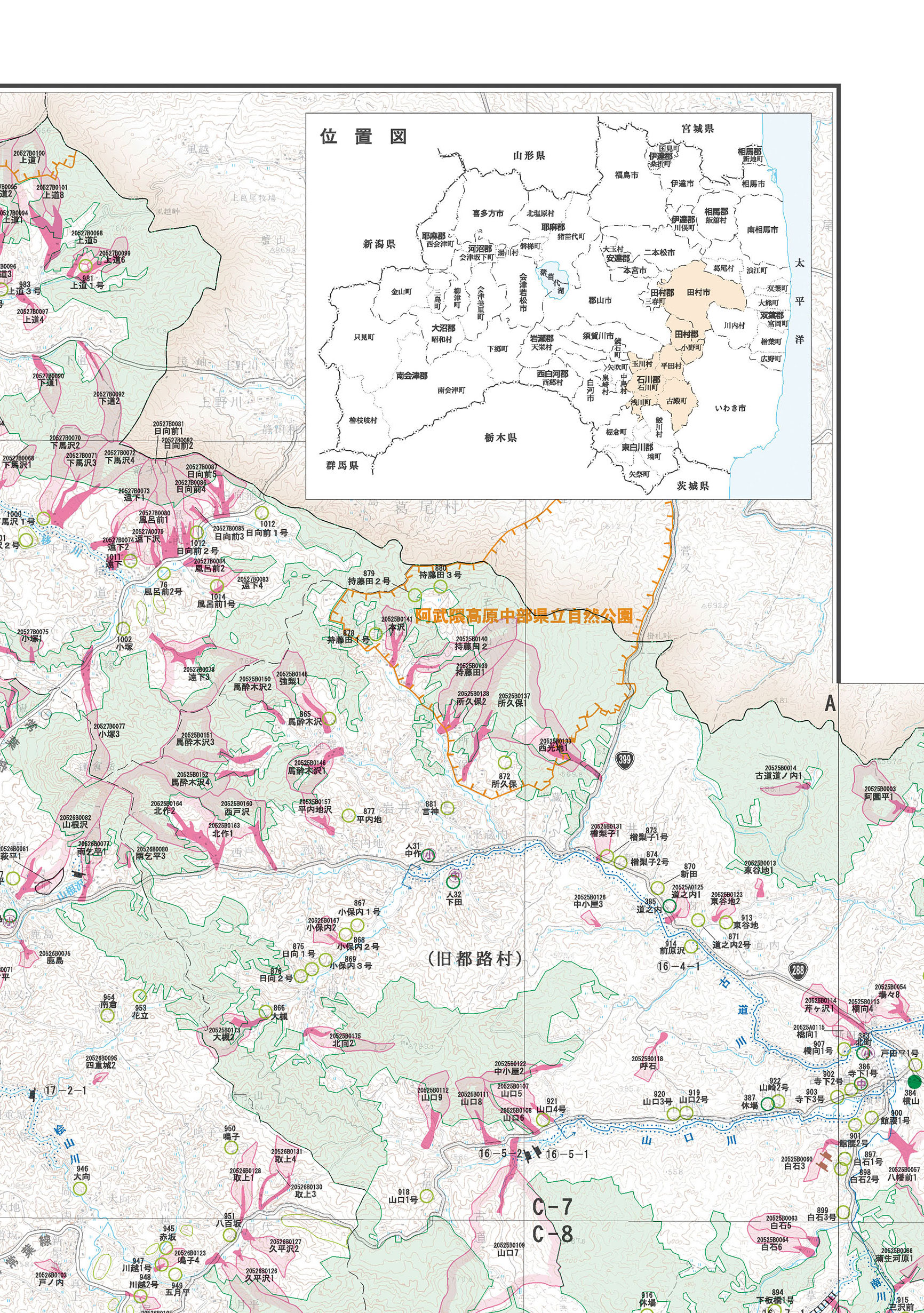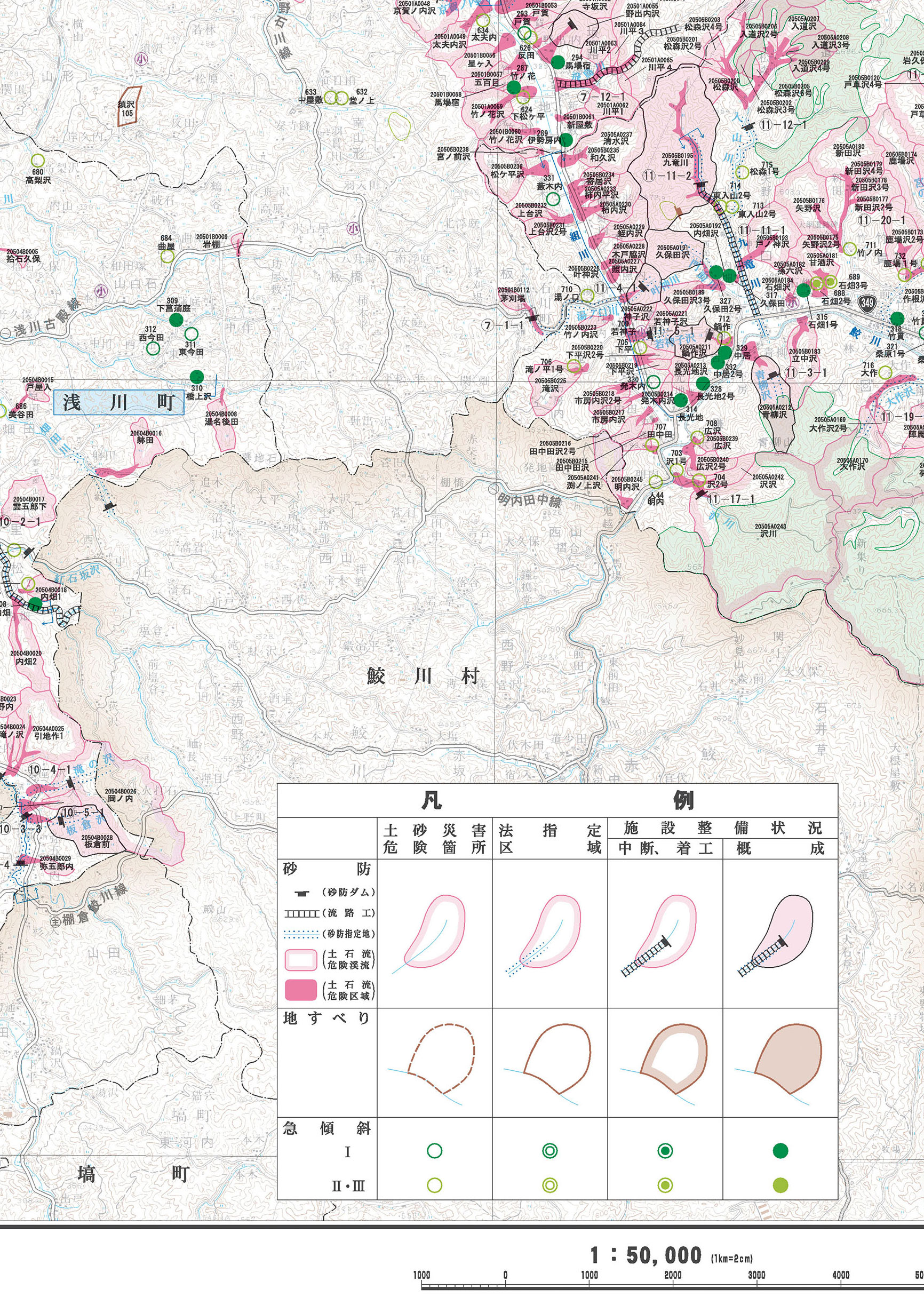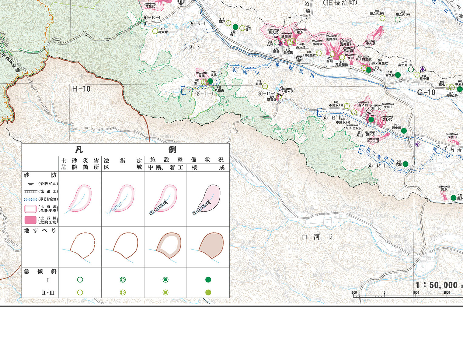 県中建設事務所管内の土砂災害危険箇所(土石流危険渓流、地すべり危険箇所、急傾斜地崩壊危険箇所)、法律に基づく指定地(砂防指定地、地すべり防止区域、急傾斜地崩壊危険区域)を記した5万分の1の縮尺の地図です。