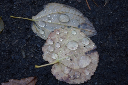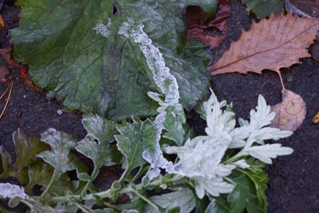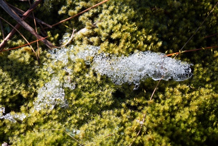落葉と氷 落葉と雪解け水