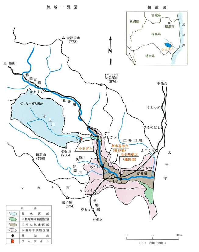|  小玉ダムの場所 夏井川右支川小玉川は、いわき市三和町差塩字館下に水源を発し、流域面積72.6平方km・流路延長約20kmの河川で、 小玉ダムは夏井川合流点から約4km上流に位置しています。上流から小玉ダムまでの流域面積は67.8平方km、延長約16km、 標高差は約300mです。 ▲小玉ダムの位置及び流域一覧図(クリックで原寸表示します)