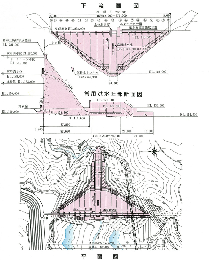 |  ダム型式(だむけいしき )は重力式コンクリートダム 貯水池の水圧荷重やその他の荷重に堤体の重さによって対抗し、 これをダム基礎の岩盤に伝えるコンクリート製のダムで、非常に強固な岩盤の上に造られます。 必要な堤体重量を確保した堤体断面(三角形)を有する構造物となります。コンクリートダムとしては最も一般的なものです。 ▲ダム主要3面図(クリックで原寸表示します)