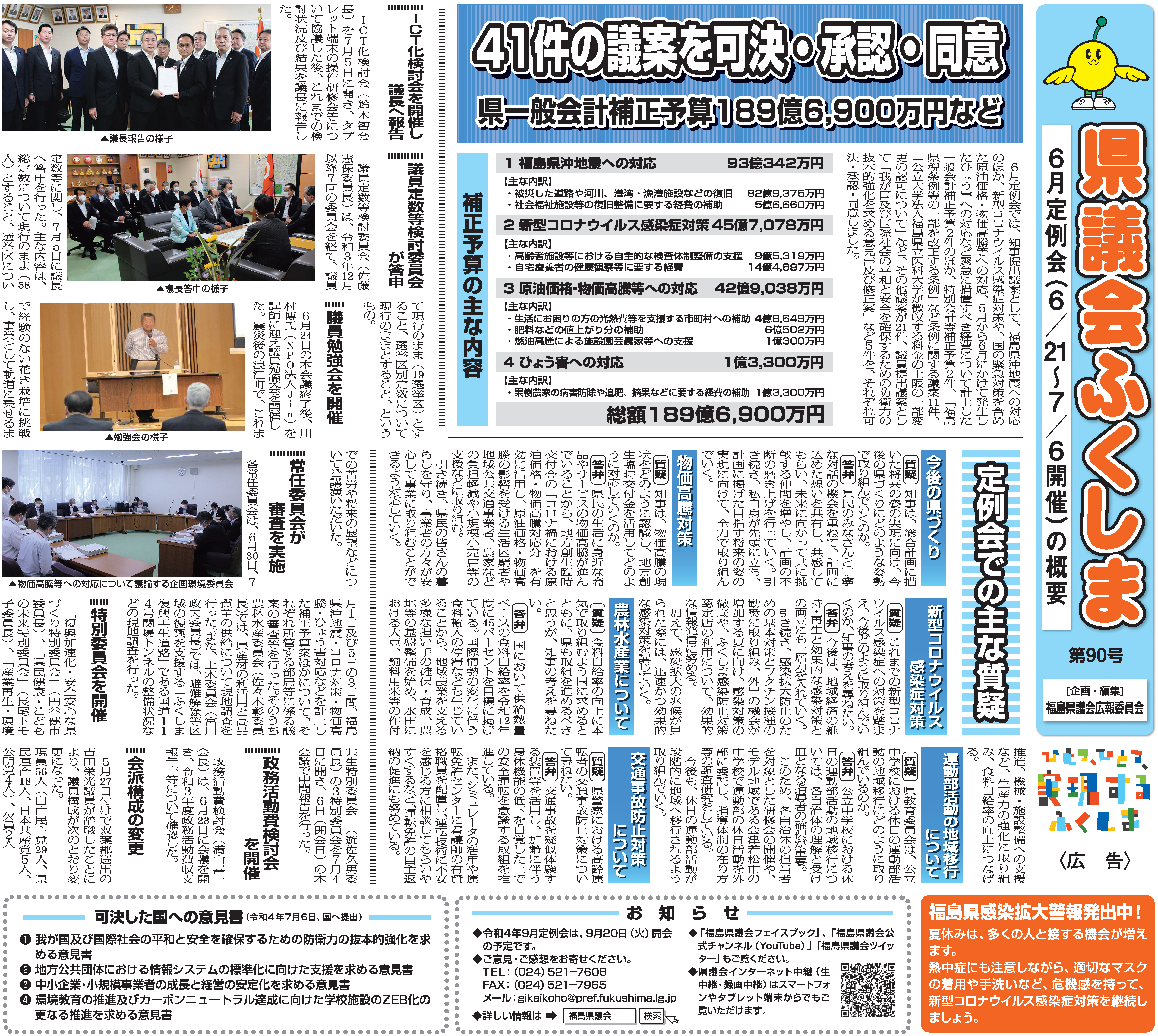 各定例会の概要について、定例会終了後40日以内の日曜日に、福島民報新聞、福島民友新聞に全面広告の形で掲載し、県民の皆さんへ報告しています。