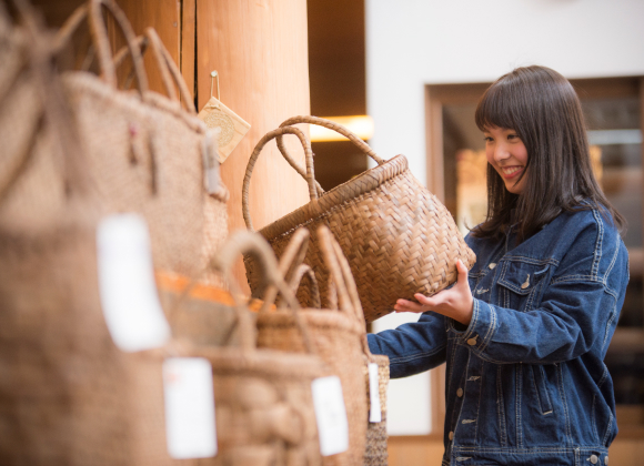 三島町生活工芸館では、「奥会津編み組細工」の展示・販売を行っています。「奥会津編み組細工」は、奥会津地方の山間部で採取されるヒロロ、山ブドウ、マタタビなどの植物を使った編み組細工で、積雪期の手仕事として、籠やざるなどが作られてきました。自然素材を用いた、丈夫で素朴な手編みの良さが特徴です。