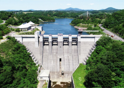 三春ダムのある三春町は、春に梅、桃、桜が同時に開花することから、「三つの春」が訪れる「三春」の地名となりました。ダム近くにある、樹齢千年を超えると言われる「三春の滝桜」など、ダム周辺には見どころがたくさん。展望広場や天端から見学することができ、事前予約すればダム内部の見学も可能です(団体のみ)。