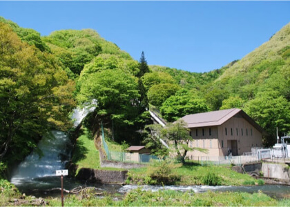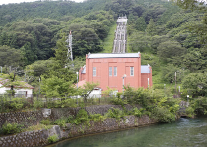 丸守発電所同様、安積疏水関連施設のひとつ。安積疏水の高低差を利用した水力発電所で、1899年に作られました。当時は珍しい長距離送電により、郡山市の紡績や繊維産業の発展に大きく貢献しました。