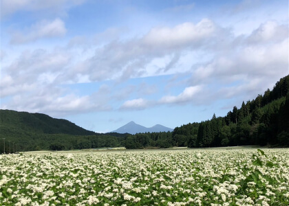 郡山市湖南町中野地区は一面にそば畑が広がっています。9月上旬には一斉に花が咲き、まさに絶景。ここを通る県道67号は別名「そば街道」と呼ばれています。昼食は生産者直営の「湖南高原そば道場食堂」で。そば打ち体験も楽しめます。