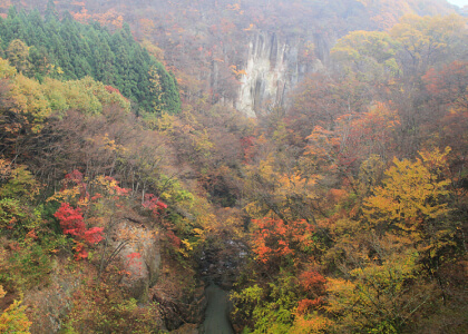 橋下の阿武隈川沿いには遊歩道が整備され、雪割橋を下から見上げることができます。この遊歩道を進むと出会える、一枚岩の滝「熊のすべり台」も一見の価値ありです。