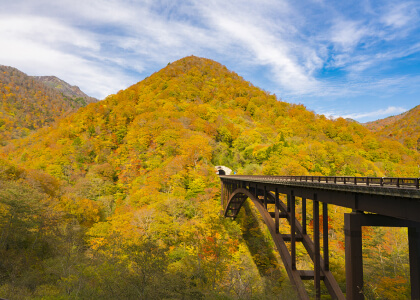 甲子大橋は国道289号の一部となる橋長199ⅿの橋梁。鋼製で、形式はアーチ橋の一種であるローゼ橋で、秋には周辺の山々の紅葉に、このローゼ橋の形と色が美しく映えます。周囲には遊歩道が整備され、多くのハイカーが訪れています。