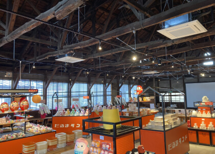 白河の伝統工芸品「白河だるま」。だるまランドでは、製造工程を見学したり、絵付け体験を楽しむことができます。だるまさんが転んだのオリジナルゲームや2mの巨大だるまガチャも人気です。