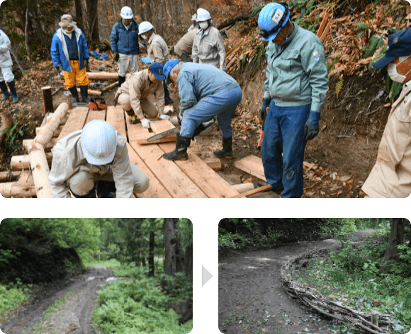 会津銀山街道の整備、修復は人力での作業を基本とし、動植物などの自然環境や景観に配慮した素材や工法で行っています。地元住民や専門家、「銀山街道を活用して地域を元気にする会」などと協力し、力を合わせて古道再生に取り組んでいます。また「銀山街道を活用して地域を元気にする会」では、どなたでもご参加いただくことのできる、「道普請体験プログラム」を実施しています。地元住民や専門家と一緒に銀山街道に入り、道普請の目的や昔ながらの工法を知り、実際に街道の補修、整備を体験するプログラムです。