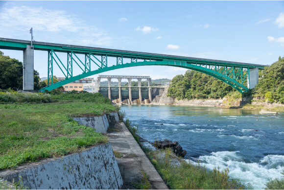 1953年に竣工した、只見川本流にあるダムの中では最も下流に位置するダム。磐越自動車道 会津坂下ICのそばにあり、磐越自動車道からも眺めることができます。ダム天端は駐車場を兼ねた広場となっております。この天端は片門地区と坂本地区を最短距離として結ぶ道路橋としても機能していますが、幅員制限1.5ⅿと道幅が狭く、重量制限1.0トンのため、軽自動車しか通行できません。