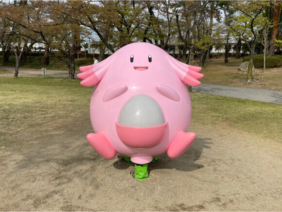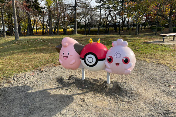 郡山市の開成山公園内に、2022年3月に開園した「ラッキー公園 in こおりやまし」。園内に入ってまず目を引くのは、高さ約6mもある巨大な「ラッキー」の遊具。スライダーや音の出る遊びパネルもあり、さまざまな遊びをたのしむことができます。ほかにもさまざまなポケモンたちをモチーフにした遊具を設置。開成山公園には広い園内を生かしたウォーキングコースやバラ園などがあるほか、野外音楽堂には、ポケモンの絵が描かれたマンホール蓋『ポケふた』も設置されており、家族で楽しめるスポットです。