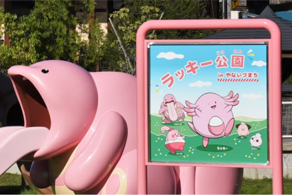 道の駅「会津柳津」の芝生公園に、2022年7月に開園した「ラッキー公園 in やないづまち」。ふくしま応援ポケモンである「ラッキー」をはじめ、「ベロリンガ」「ピィ」「ププリン」「ピンプク」「ピカチュウ」など、いろいろなポケモンたちに出会えます。『Pokémon GO』で遊んでいる人は、野生の「ラッキー」に出会えるかも?ポケモンの絵が描かれたマンホール蓋『ポケふた』も探してみて!道の駅「会津柳津」では、無料の足湯も楽しめます。