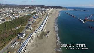 ◆この動画は平成28年12月21日に工事現場上空からドローンにより撮影したものです。◆福島県いわき市四倉地区は、地震・津波により海岸施設に被害を受け、復旧工事が行われています。 上空からの映像では、...