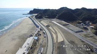 ◆この動画は平成28年12月21日に工事現場上空からドローンにより撮影したものです。◆福島県いわき市薄磯地区は、地震・津波により海岸施設、県道に被害を受け、復旧工事が行われています。 上空からの映像...