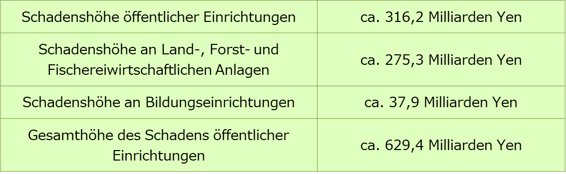 *Die geschätzte Schadenshöhe basiert auf Luftaufnahmen und weiteren Daten, die in einem Radius von 30 km um das Kernkraftwerk Fukushima Daiichi aufgenommen wurden. Ausgenommen ist die geschätzte Schadenshöhe in kommunalen Gemeinden, der Stadt Minami-Soma und der Dörfer im Landkreis Futaba