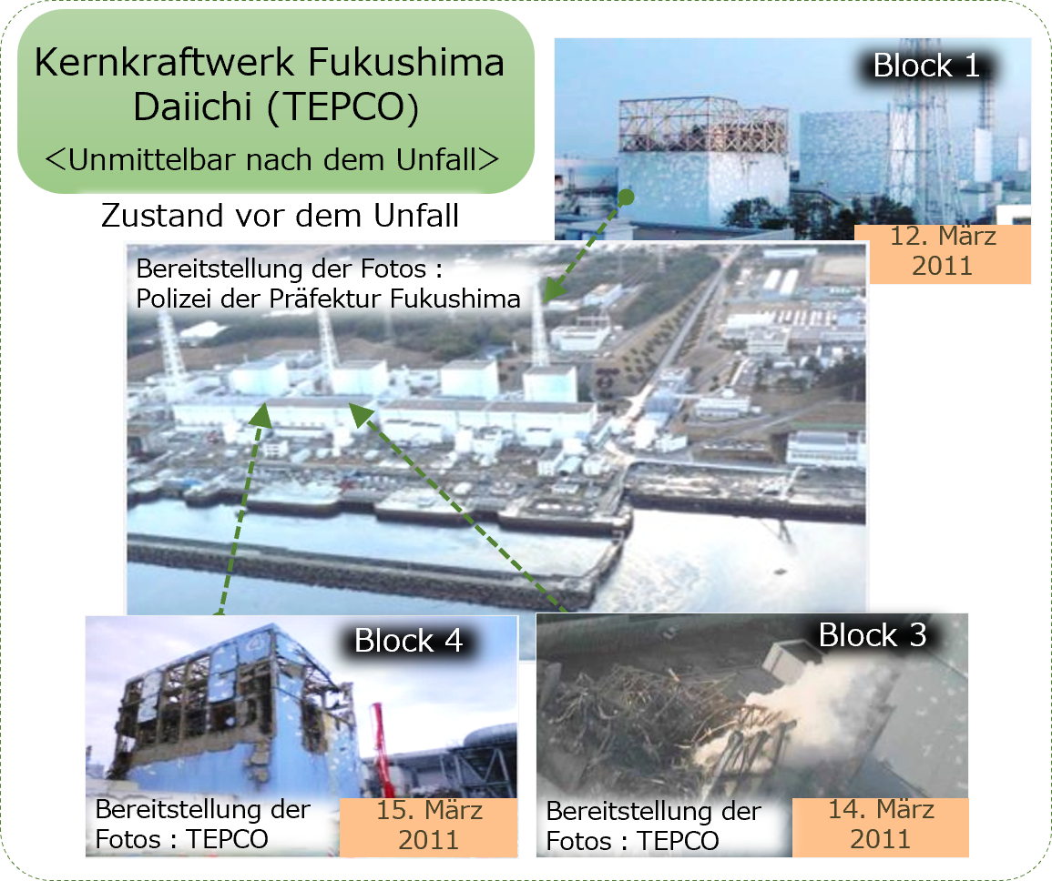 Das Kernkraftwerk Fukushima Daiichi von Tokyo Electric Power Company (TEPCO) verlor in Folge des Erdbebens seine externe Stromversorgung. Anschließend unterbrach der Tsunami die Notstromversorgung, weshalb die Einrichtung zur Kühlung der Reaktoren in den Blöcken 1 bis 3 ausfiel.