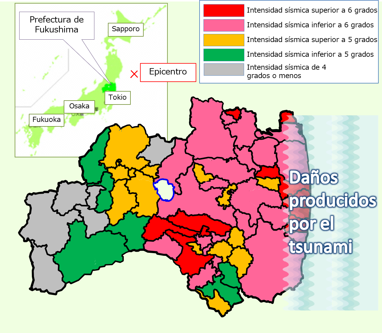 ※Muertes relacionadas con el terremoto: Estas muertes no fueron causadas directamente por el terremoto, sino por causas indirectas como por ejemplo, el deterioro de la condición física durante el período de evacuación y el exceso de trabajo.