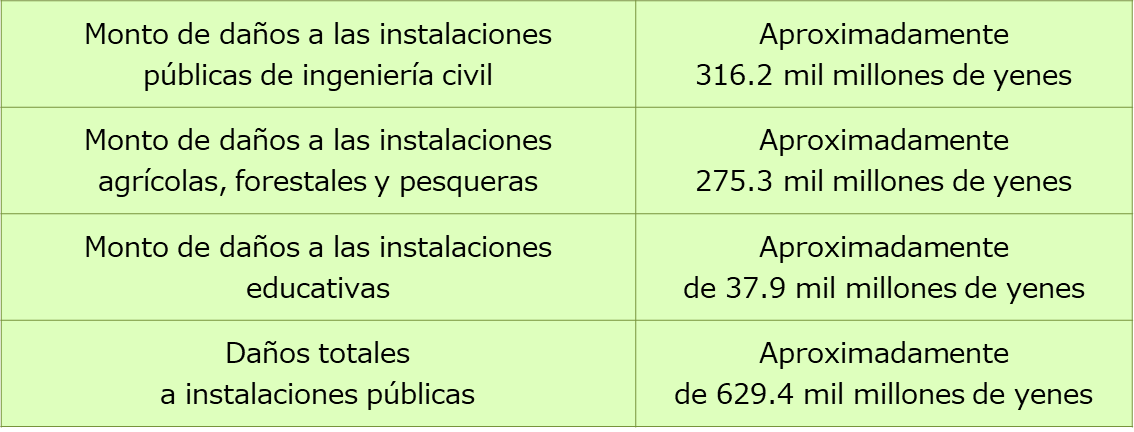※Cantidad estimada de los daños a partir de fotografías aéreas y otros, dentro de los 30 km a la redonda de la Central Nuclear de Fukushima Daiichi bajo la jurisdicción de la prefectura. No se incluyen los daños estimados de una parte de la ciudad de Minamisoma, ocho pueblos y aldeas en el condado de Futaba.