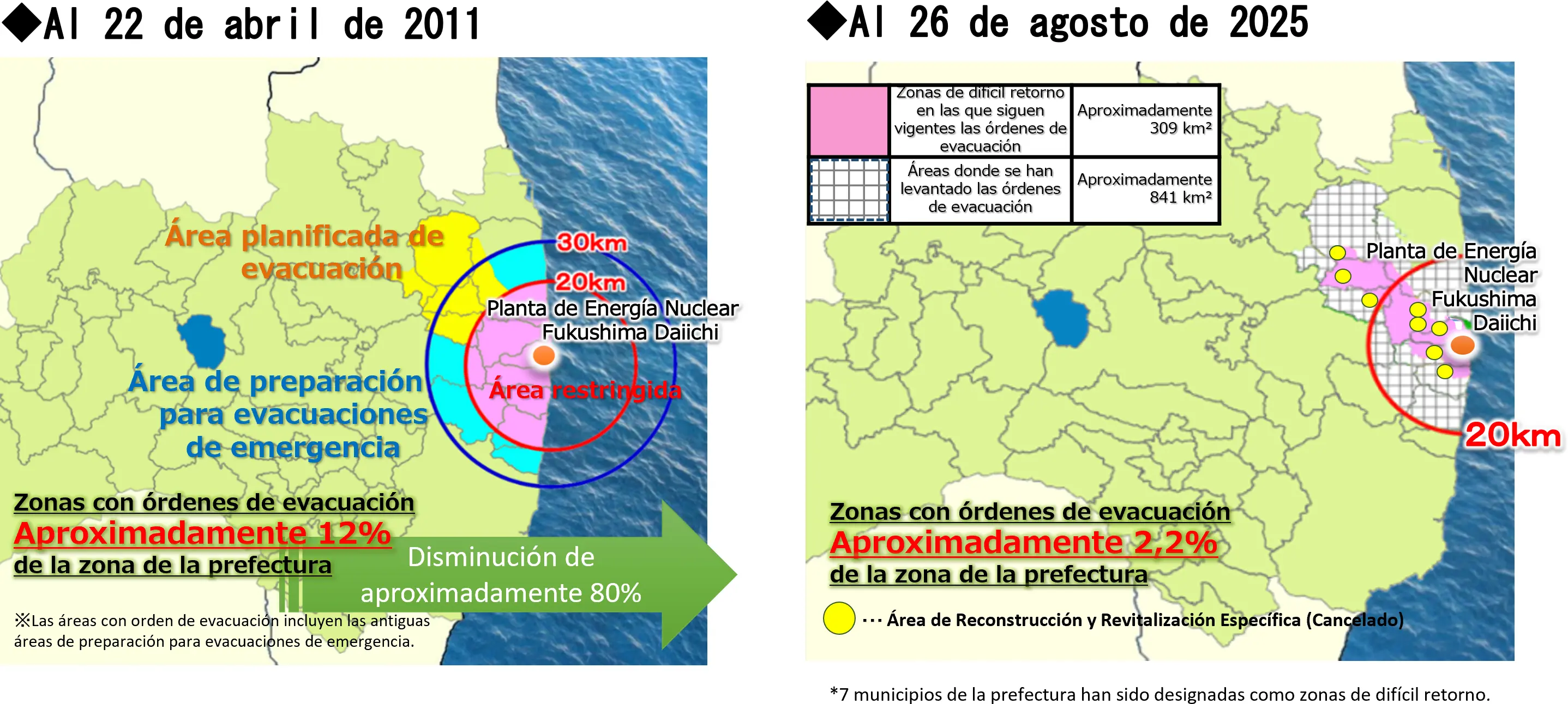 Se han levantado las órdenes de evacuación debido al mejoramiento del entorno para el regreso a casa. El área de la prefectura con órdenes de evacuación ha disminuido de aproximadamente 12% a alrededor del 2,2%.