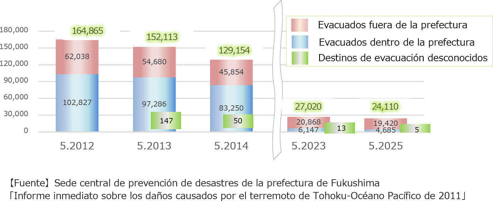 Después de alcanzar un máximo de 164.865 en mayo de 2012, la cantidad de evacuados ha disminuido. Actualmente 24,000 personas continuan evacuadas.