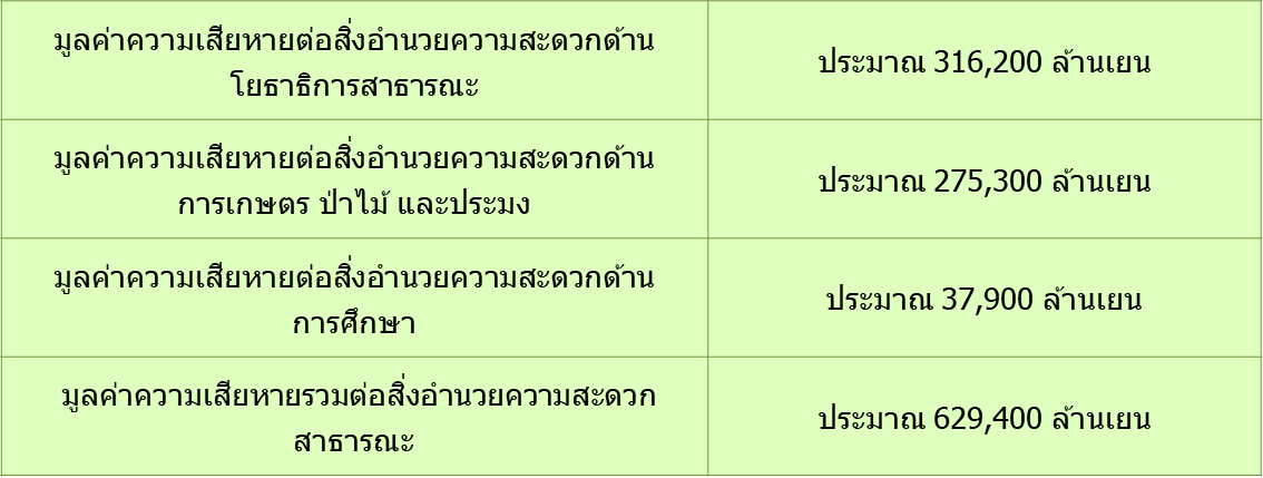 *คำนวณมูลค่าความเสียหายคร่าวๆ โดยประมาณจากภาพถ่ายทางอากาศ ฯลฯ ภายในระยะ 30 กม. จากโรงไฟฟ้านิวเคลียร์ฟุกุชิมะแห่งที่หนึ่ง ซึ่งอยู่ภายใต้การดูแลรับผิดชอบของจังหวัด ไม่รวมมูลค่าความเสียหายคร่าวๆ ในส่วนหนึ่งของเมืองมินามิโซมะรวมถึง 8 หมู่บ้านและอำเภอในเขตฟุตาบะ ซึ่งอยู่ภายใต้การดูแลรับผิดชอบของเทศบาล