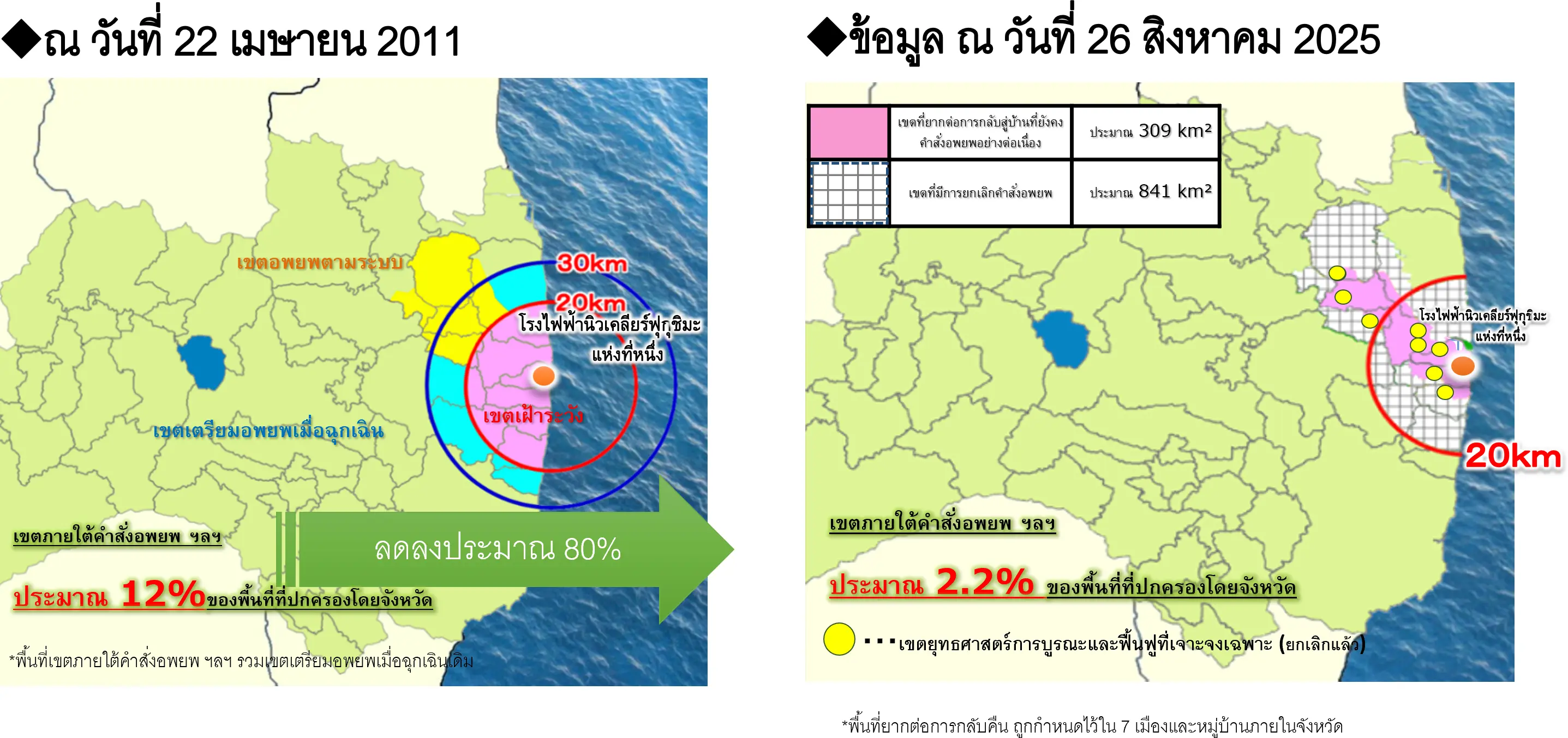 ตั้งแต่เดือนมิถุนายน ปีเรวะที่ 4 (ค.ศ. 2022) จนถึงเดือนพฤศจิกายน ปีเรวะที่ 5 (ค.ศ. 2023) มีการยกเลิกคำสั่งอพยพทั้งหมดของเมืองและหมู่บ้าน 6 แห่ง (เมืองโทมิโอกะ เมืองโอคุมะ เมืองฟุตาบะ เมืองนามิเอะ หมู่บ้านคัตสึราโอะ หมู่บ้านอีทาเตะ) ที่ถูกกำหนดให้เป็นเขตยุทธศาสตร์การบูรณะและฟื้นฟูที่เจาะจงเฉพาะ