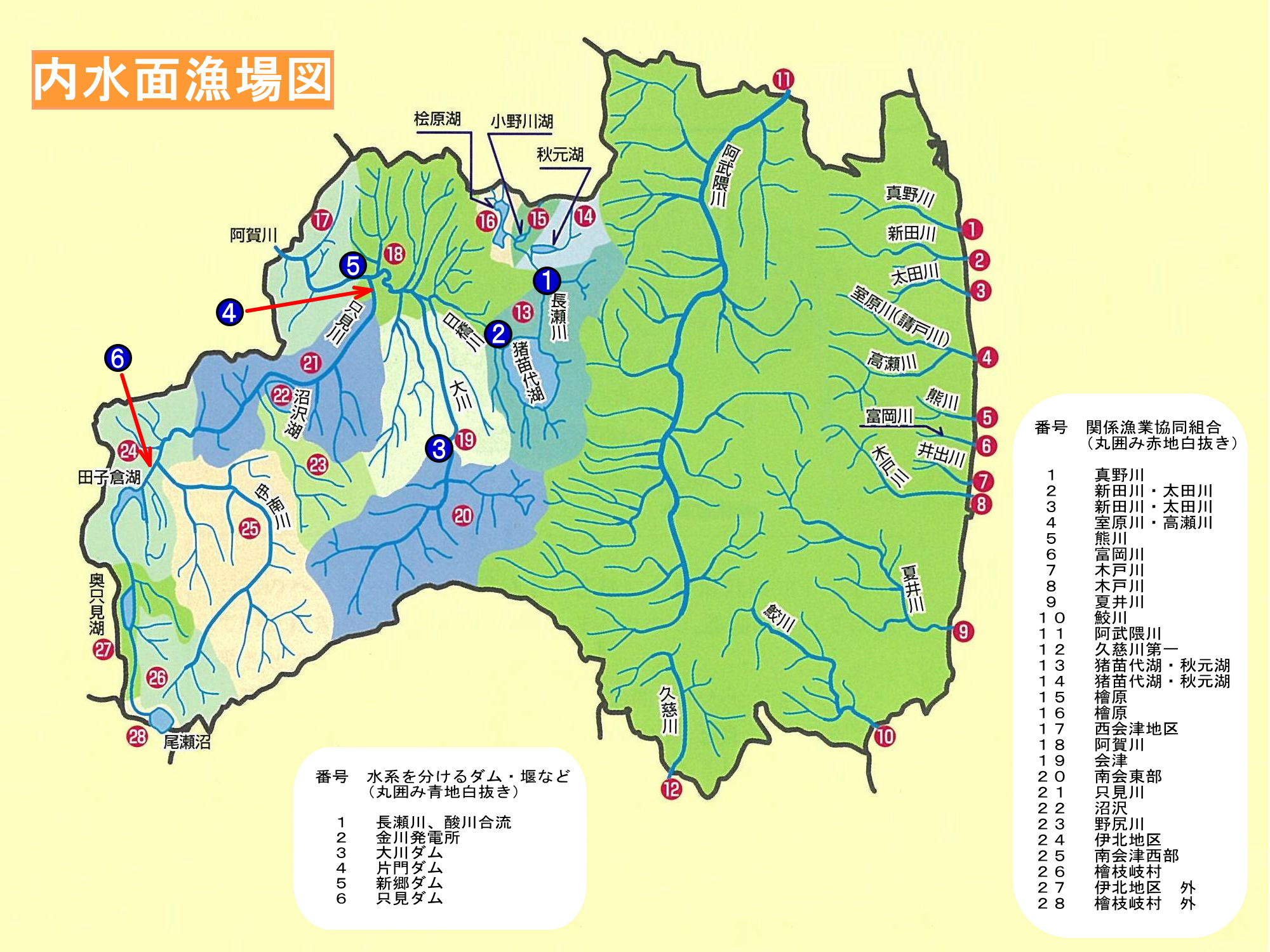 2.秋元湖、小野川湖及び檜原湖並びにこれらの湖に流入する河川(支流を含む。)並びに長瀬川(酸川との合流点から上流の部分に限る。)において採捕された「こい」(養殖により生産されたものを除く。)