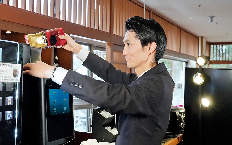 ロビーの整備やコーヒーマシンの清掃など、お客様が快適に過ごせる空間づくりに取り組んでいます。ミーティングで、予約内容に間違いがないかを事前に確認し、連携を取りながら運営を行っています。
