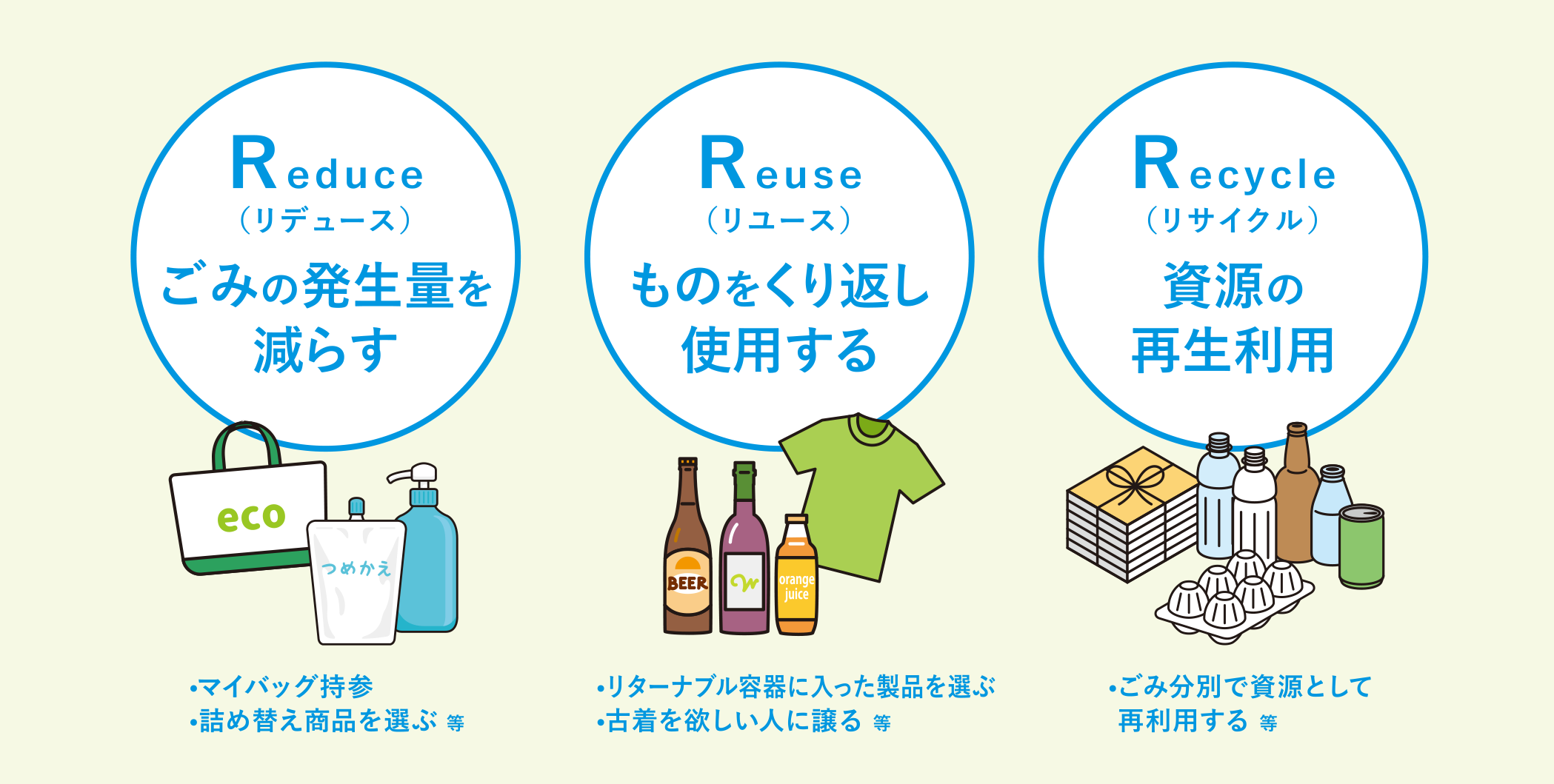 「3つの“きり”」(生ごみの水きり、料理の食べきり、食材の使いきり)の実践や「リサイクル可能物の分別の徹底」を一人ひとりが行うことで、ごみを減らすことができます!ぜひ、今日からできることを始めてみましょう!