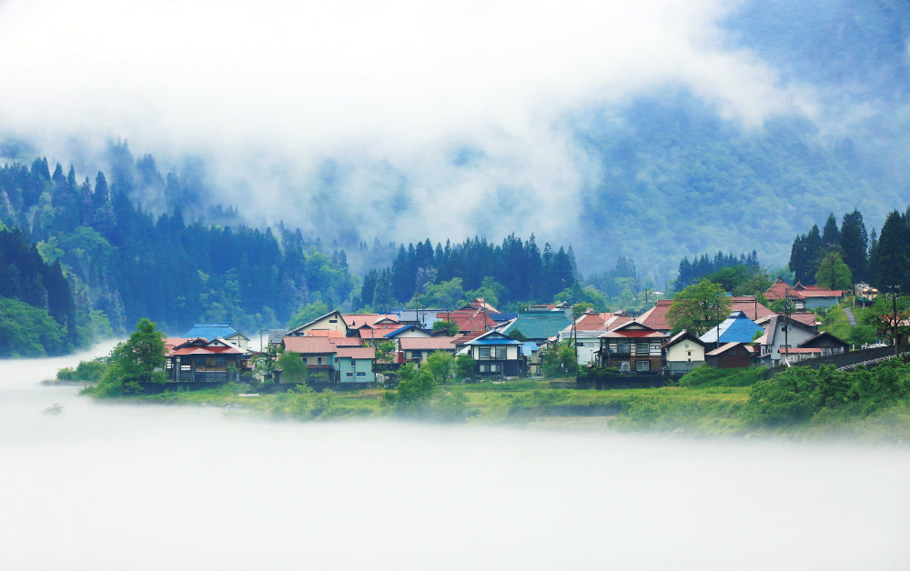 豪雪地帯である本地域では、雪による倒壊を防ぐため、屋根の先端がとがった特有の構えを持つ家々が建ち並び、河川の流れとともに幻想的な景観を形成しています。