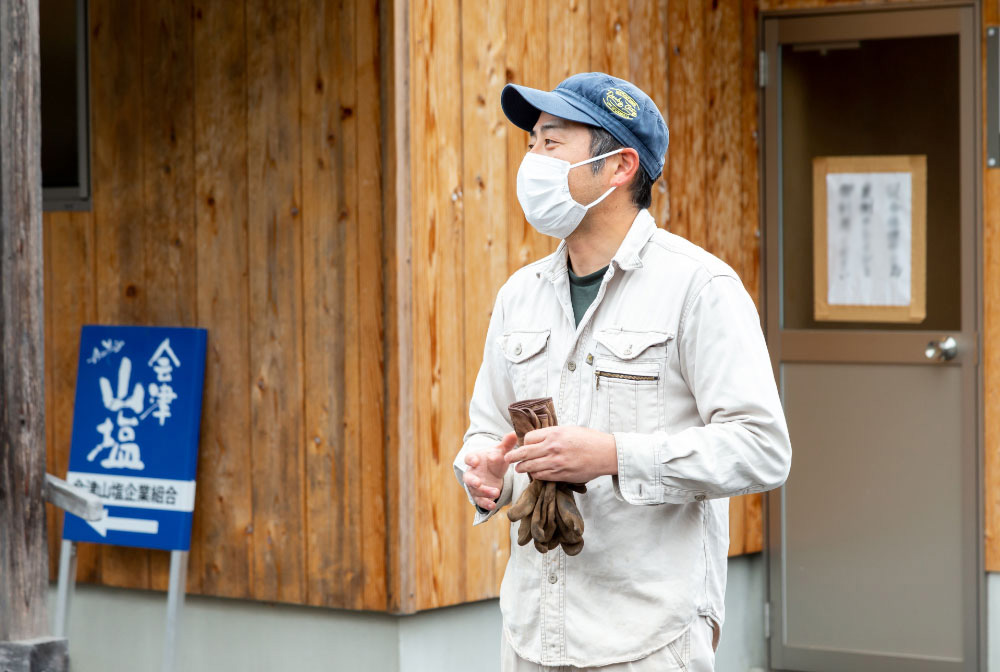 裏磐梯から喜多方市へと抜ける国道459号を走り、「会津山塩企業組合」へ。この山あいの地に大塩裏磐梯温泉が湧いたのは、弘仁年間(810~824)のことと伝えられています。「グリーンタフ」と呼ばれる地層に閉じ込められた太古の海水が、高温の地下水に溶け出して源泉となり、村ではこれを利用した塩づくりが盛んになりました。