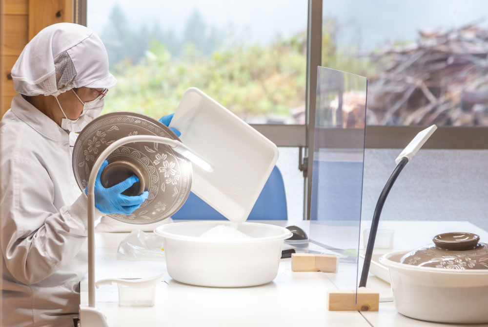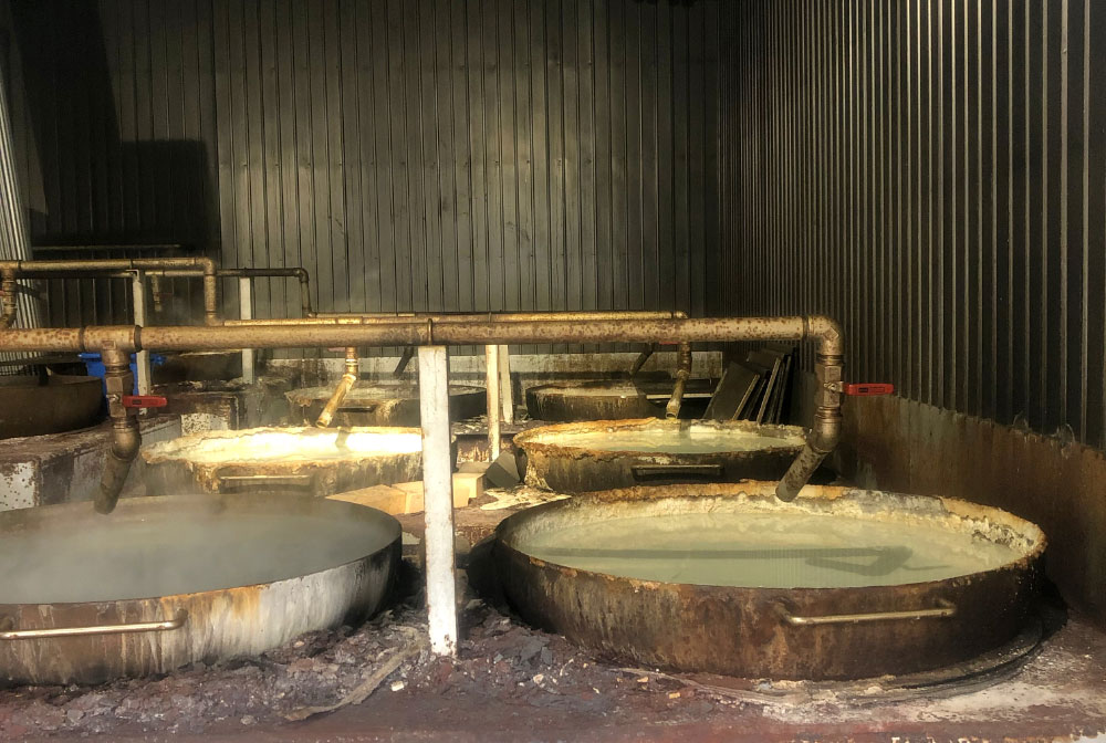 一度は途絶えたこの塩づくりを、昔ながらの薪釜焚きで復活。地元の資材を使いながら、新たな雇用と地域の名品を生み出しています。温泉水を煮詰めて作った「山塩」は旨みがあり、一般的な海水塩よりも多くミネラルが含まれています。