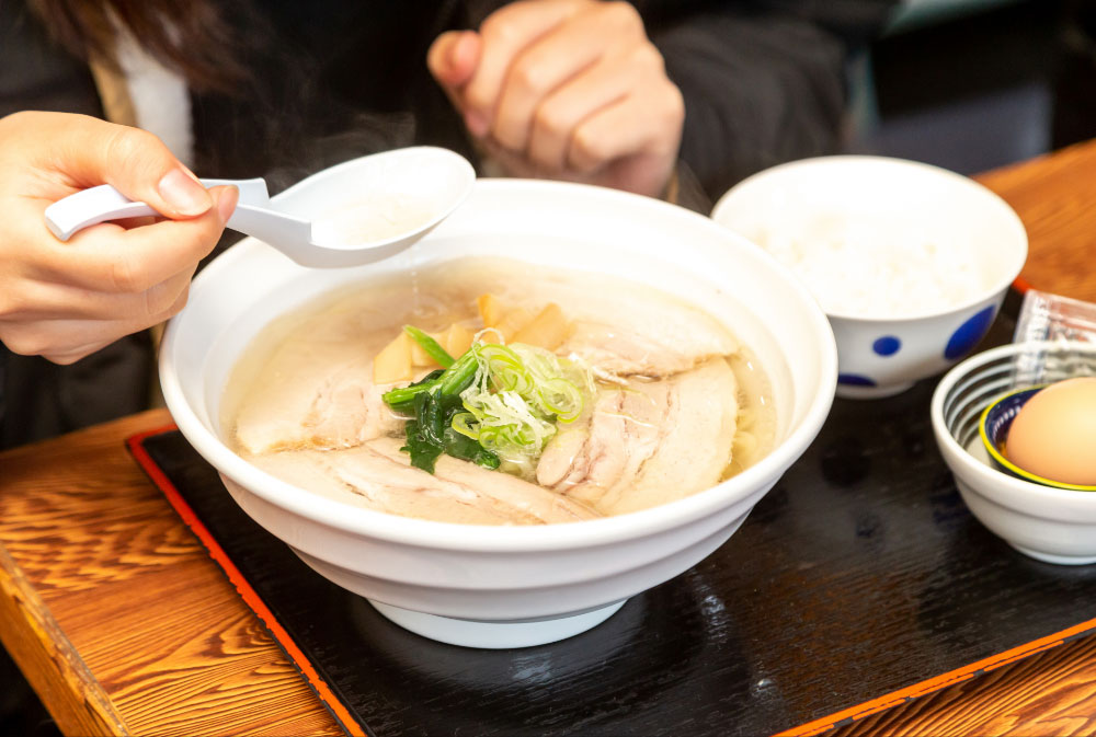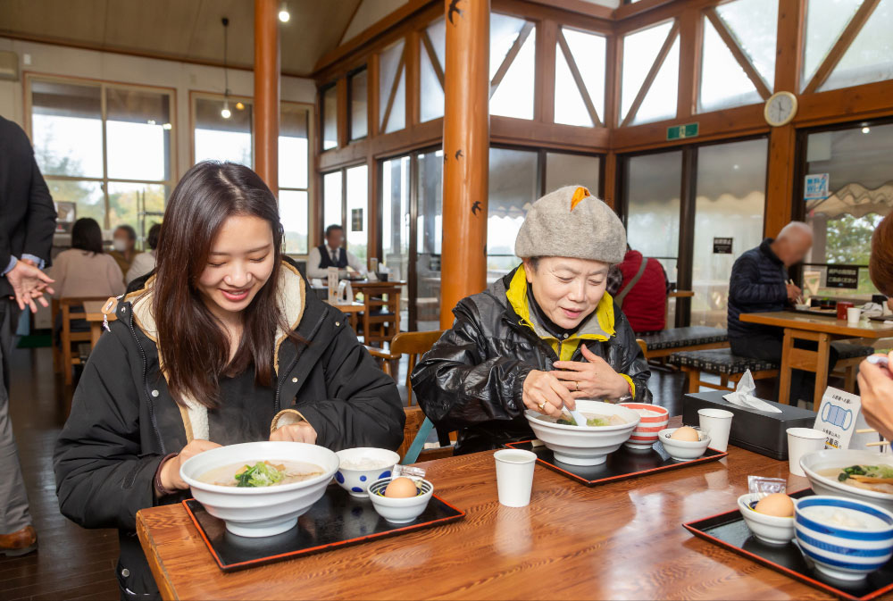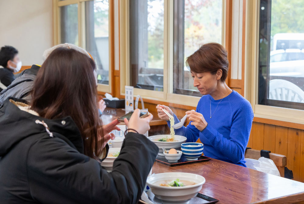 薪釜焚き製法によりじっくりと時間をかけて製塩される山塩は、生産量が決して多くはありません。しかしその味わいの豊かさがさまざまな料理に利用され、会津の新しい食のブランドとして注目されています。昼食は道の駅裏磐梯のレストラン「桧原亭」で、この山塩を使った「山塩ラーメン」。まろやかでカドのない塩味が、もちもちの縮れ麵と相性抜群です。500年以上も前から会津に生息していたと言われる会津地鶏の卵かけごはんとともに味わいました。