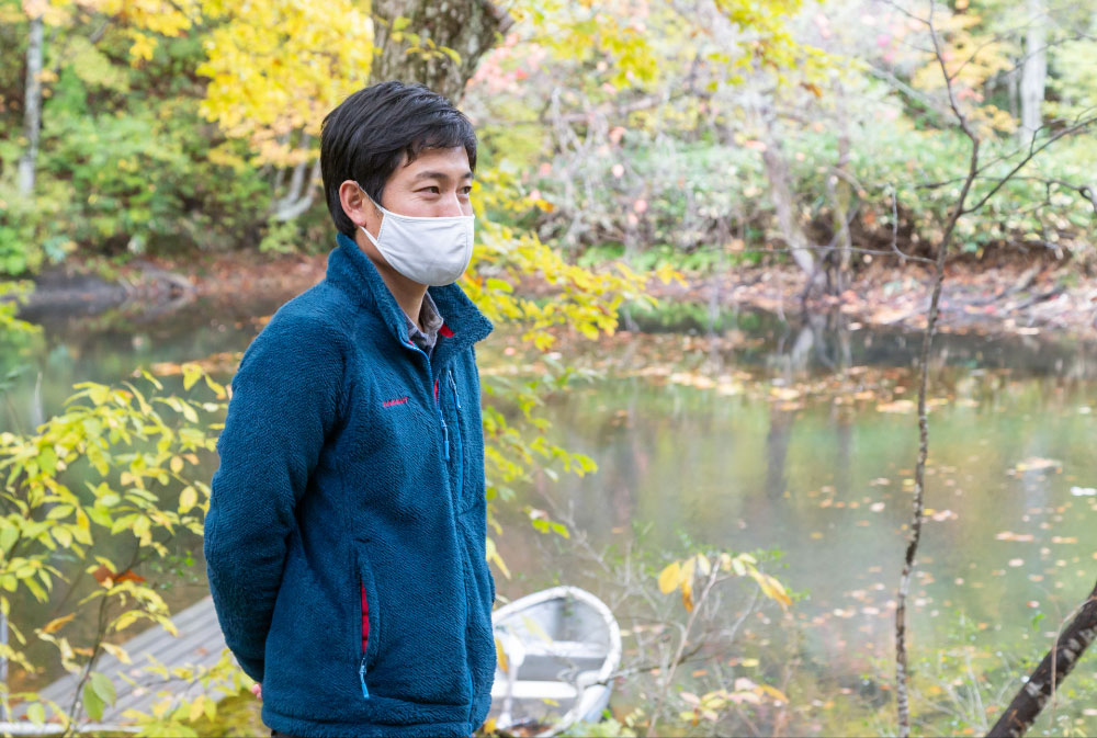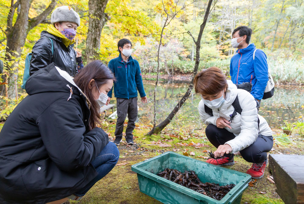裏磐梯の大自然の中で、アットホームなもてなしをしてくれるペンションに滞在するのも選択肢のひとつ。「ペンションとも」の敷地内にはゆったりと沼が広がっており、そこには特定外来種であるウチダザリガニが生息しています。裏磐梯では、本来は駆除対象でしかないウチダザリガニを釣りや漁といったアクティビティ、さらにはご当地グルメとして活用の道を探っています。