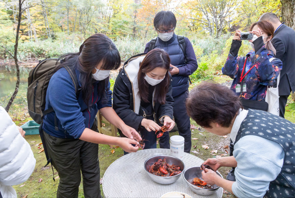 参加者からは、『北海道の然別湖でもウチダザリガニを食の対象としているけれど、そちらでは一晩かけて泥を吐かせています。でも、この沼のものは水がきれいなせいかそのまま茹でても泥臭くなく、ちゃんとおいしい。』との声がありました。