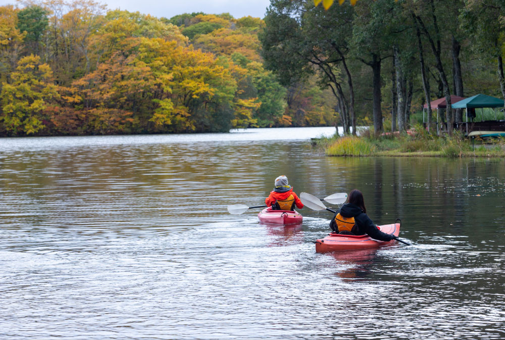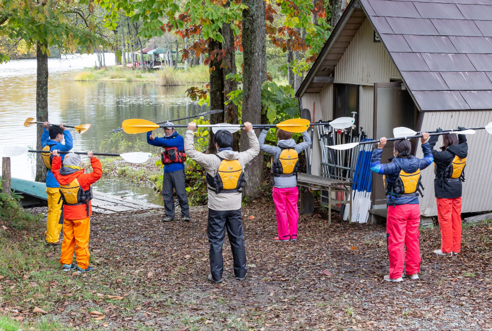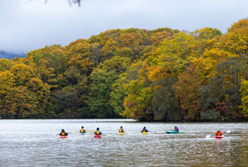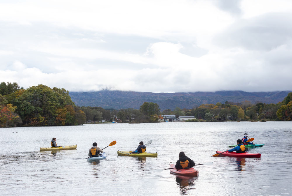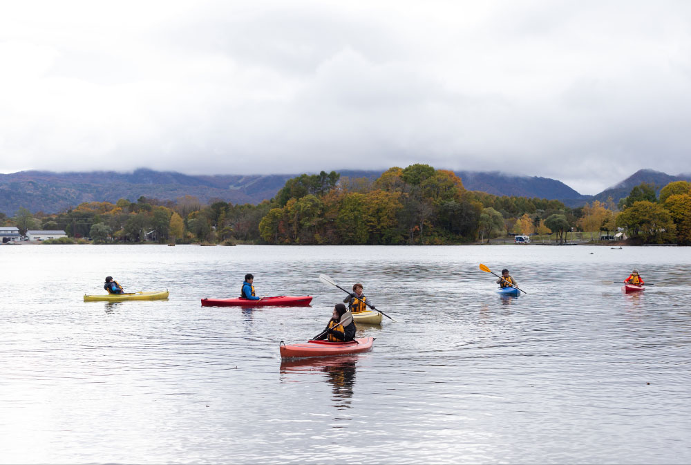 裏磐梯で最も穏やかで静かな曽原湖。美しい景観のもと、ゼロエミッションのカヌーで湖へと漕ぎ出し、湖上から火山噴火の足跡をたどります。