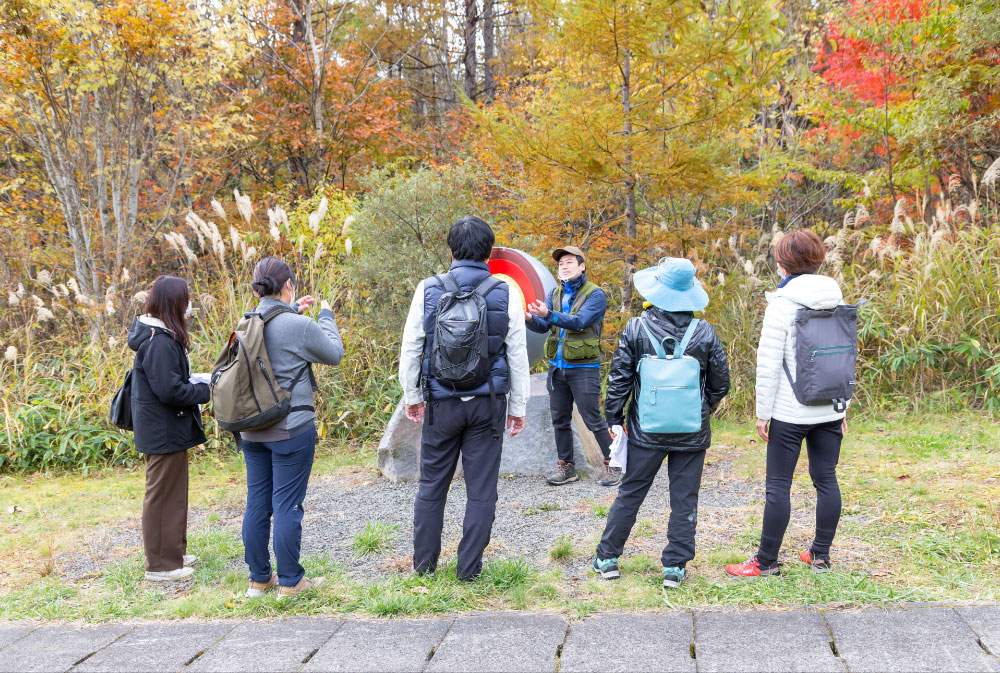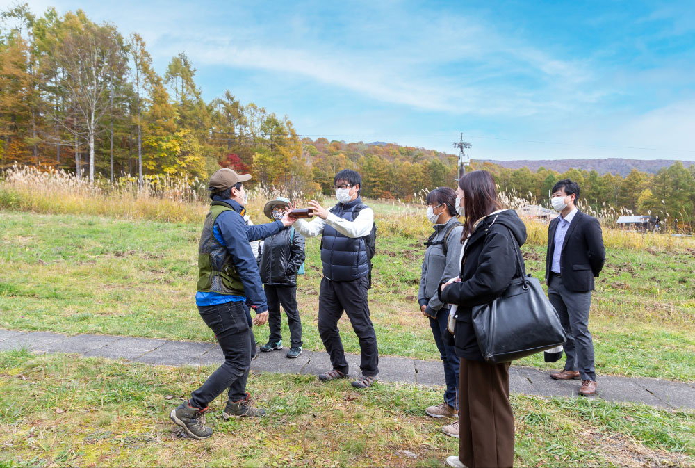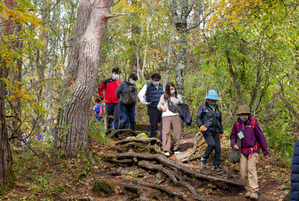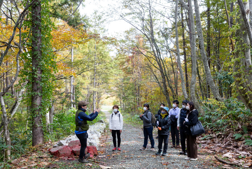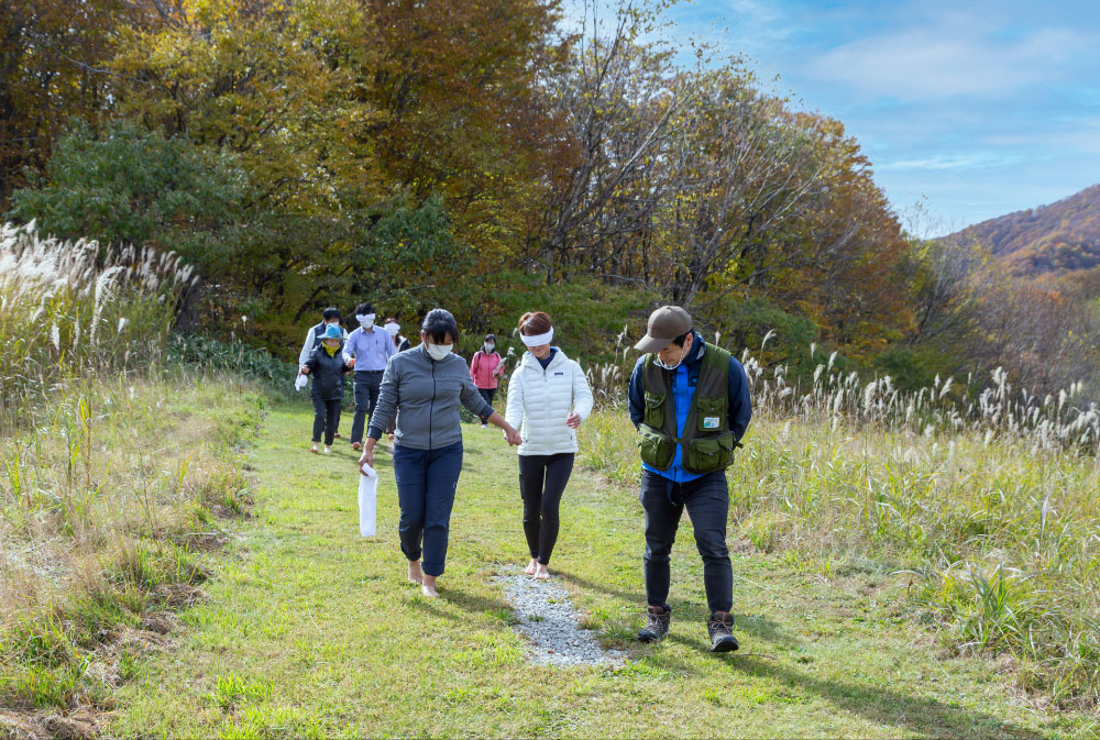 冬は真っ白なゲレンデとなるグランデコリゾート。さまざまな樹々に満ちた秋のグランデコを歩きながら、地球の誕生から現在までの歴史と環境の変遷、人類が地球に与えてきた影響、そして未来の子供たちに何を残すべきかを考えることができるプログラムを体験します。プログラムの最後に用意された「裸足の道」では、目隠しをして裸足で自然の道を歩きました。音や匂い、感触など、いつもとは異なる感覚で自然環境を感じることができます。